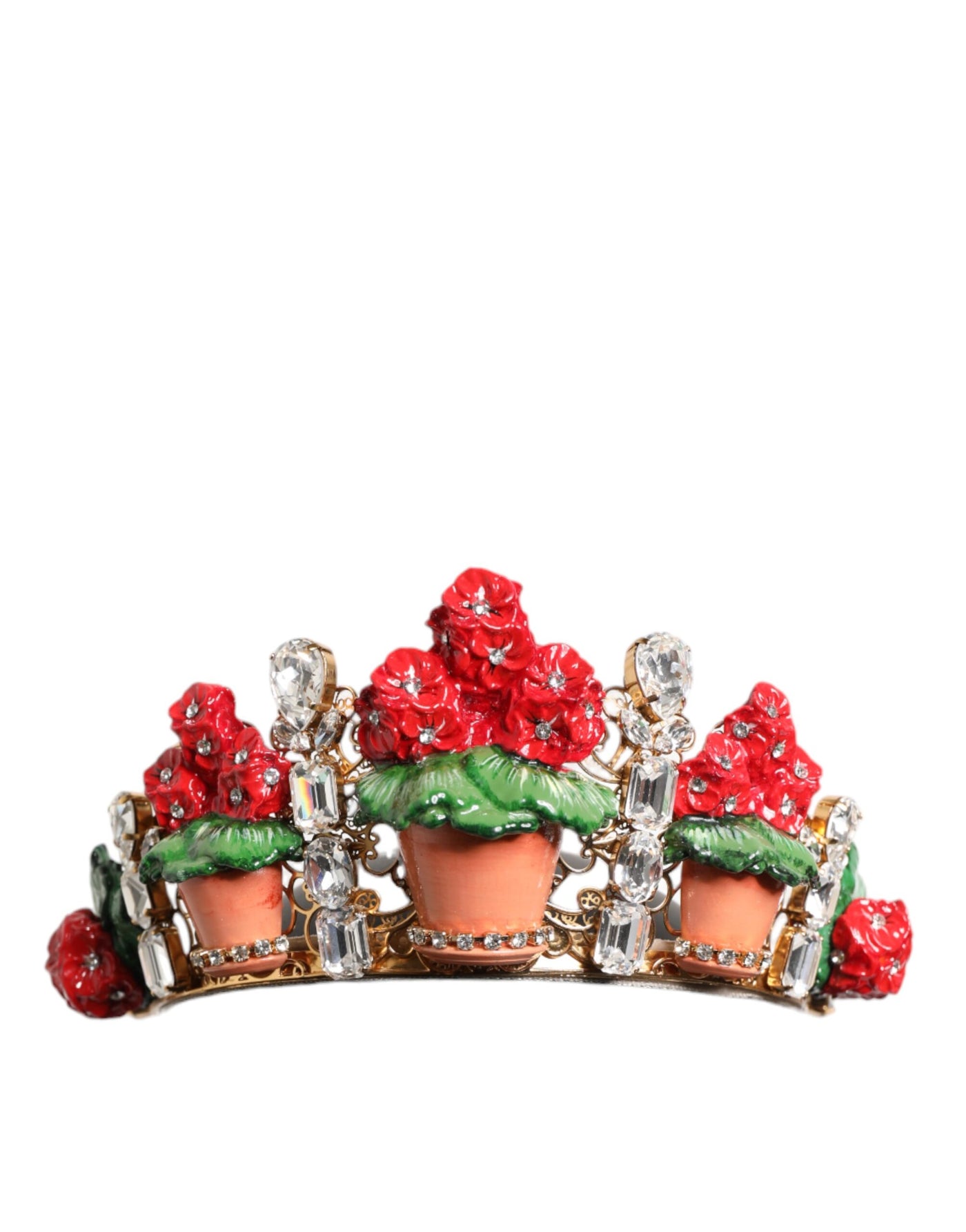 Dolce & Gabbana Red Floral Flowerpot Crystal Gold Crown Tiara Headband