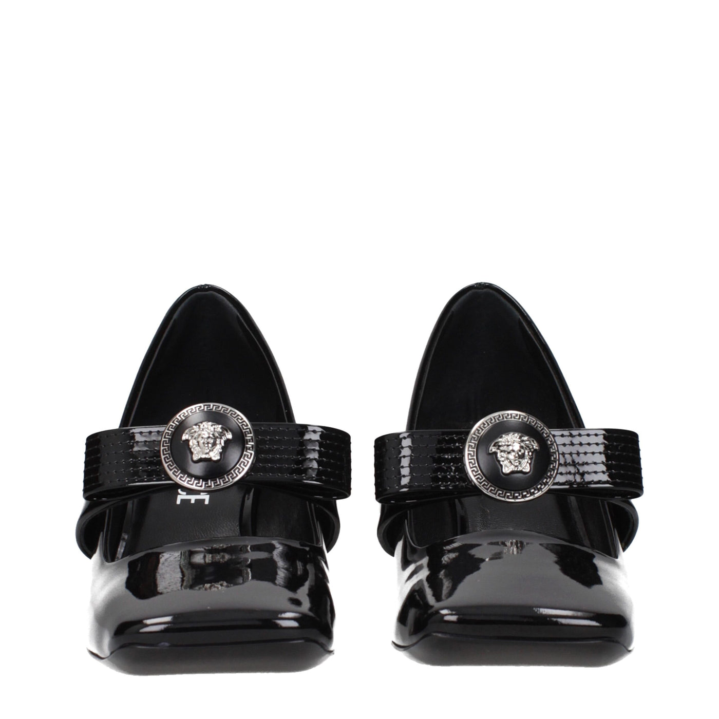 The product with MPN 1016203D2VE1B00P and code F84898 patent leather in black is a pumps designed by Versace. It has features like front detail.