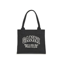 Ganni’s Logo canvas Tote Bag combines practicality with a responsible spirit. Made with 100% recycled cotton lining, it features top handles and a roomy compartment, ideal for everyday use. The GANNI logo is accompanied by the message “Have a nice day! Please recycle,” reflecting the brand’s commitment to sustainability. Completing the design is an interior zippered pocket, perfect for storing smaller items.